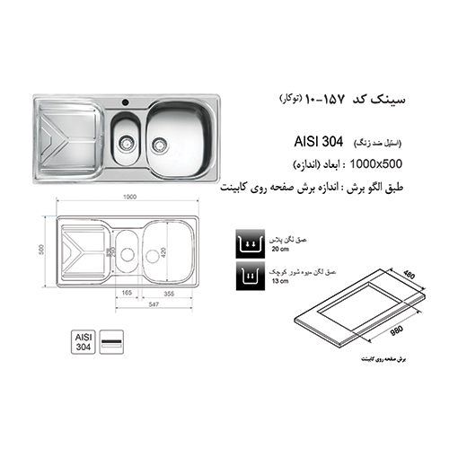 سینک ظرفشویی اخوان مدل 157 یکی از مدلهای توکار این برند است که با طراحی مدرن و کیفیت ساخت بالا، به گزینهای محبوب برای آشپزخانههای امروزی تبدیل شده است. این سینک از استیل ضد زنگ AISI 304 با ضخامت 0.8 میلیمتر ساخته شده که علاوه بر داشتن سطحی براق و زیبا، در برابر خط و خش، خوردگی و زنگزدگی مقاومت بسیار بالایی دارد. ابعاد این مدل 100×50 سانتیمتر بوده و به دلیل طراحی استاندارد، بهراحتی در کابینتهای مختلف قابل نصب است.