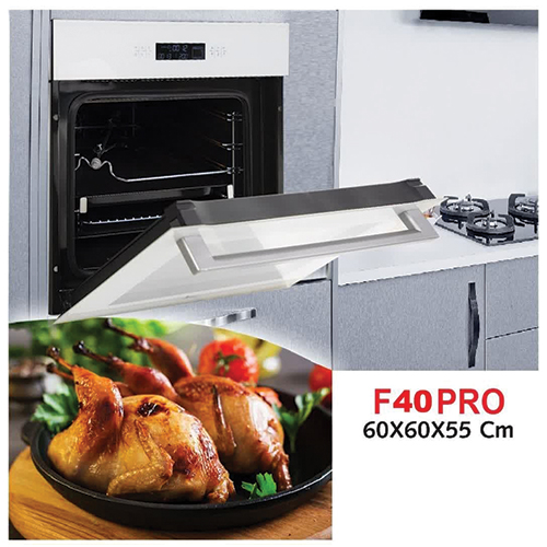 فر توکار برقی اخوان مدل F40PRO با نمای شیشه سفید ابزارخورده، با ظرفیت ۷۰ لیتر، فضای کافی برای پخت انواع غذاهای حجیم را فراهم می‌کند. عملکرد تمام برقی و بهره‌گیری از ۴ المنت قدرتمند، امکان پخت یکنواخت را فراهم کرده و ۲ سینی لعابی مخصوص پخت پیتزا همراه با شلف استیک‌پز، تنوع در آشپزی را افزایش می‌دهد. درب ۴ جداره با لولای آرام‌بند علاوه بر افزایش ایمنی، باعث حفظ بیشتر حرارت داخلی شده و استفاده از شیشه داخلی LOW-E بلژیکی، مانع از افزایش دمای سطح بیرونی درب فر می‌شود.